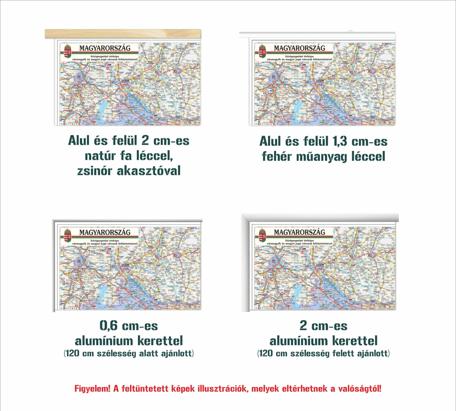 - Műanyagtáblás, tűzdelhető kivitel (A térképet vinilre nyomtatjuk és 5 mm vastag habosított műanyag lemezre kasírozzuk, melybe térképtű szúrható. Kisebb méretnél egy, nagyobb méret esetén két akasztóval látjuk el.).