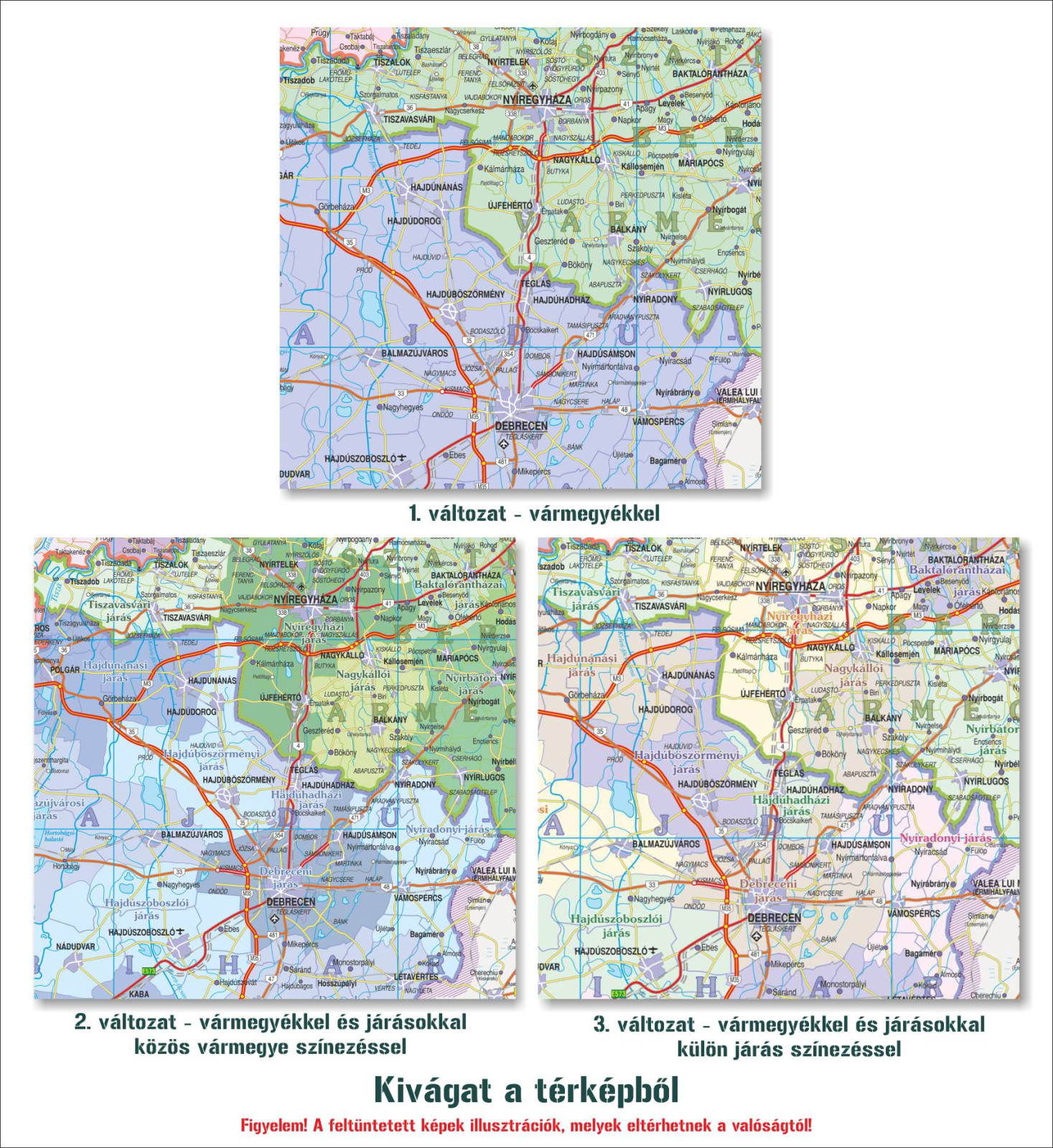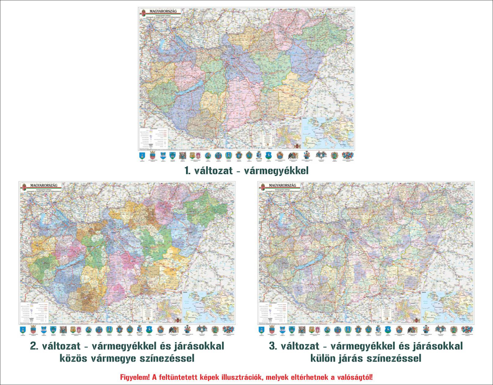 - változat: Magyarország közigazgatási térképe vármegyék és járások jelölésével. A járások a vármegyék színeiben kerültek kialakításra.